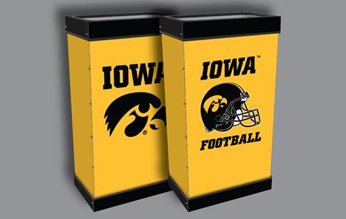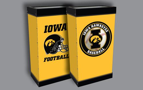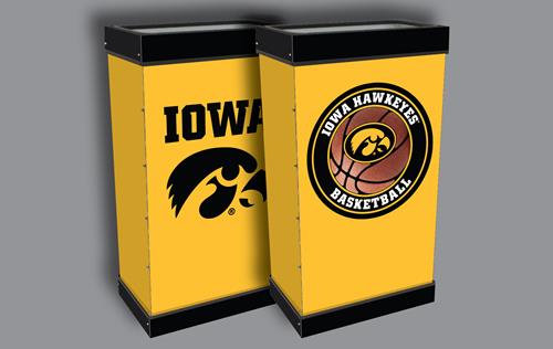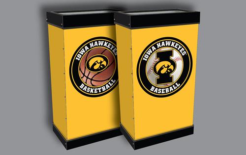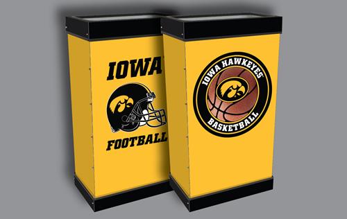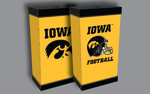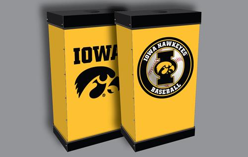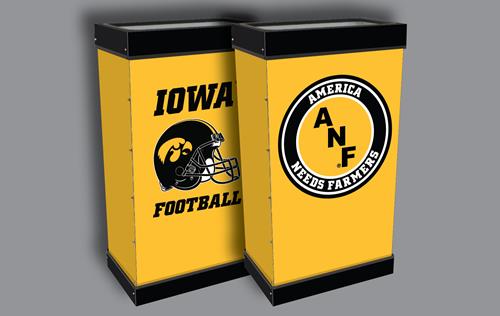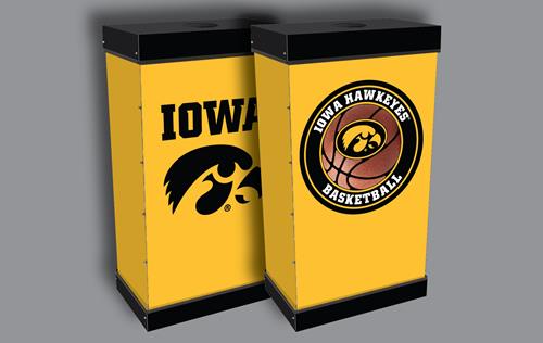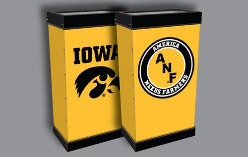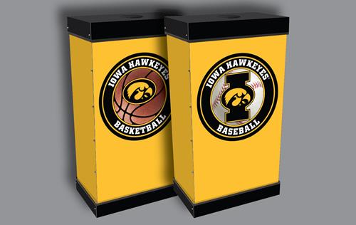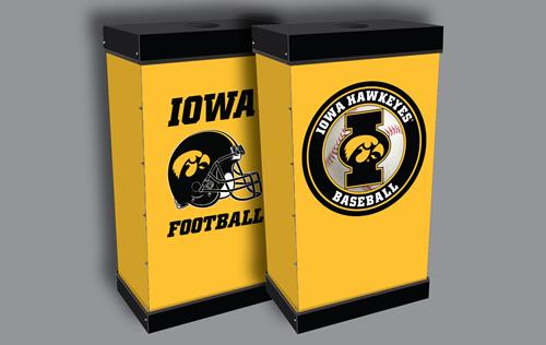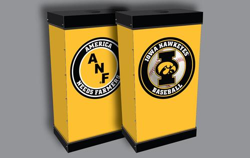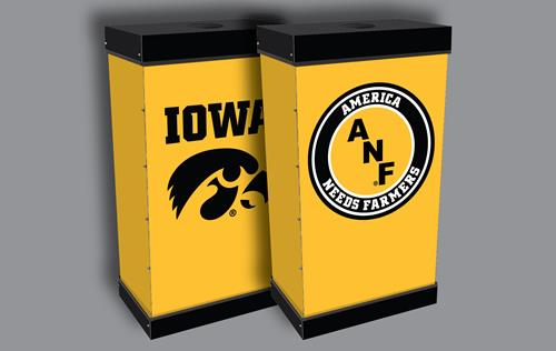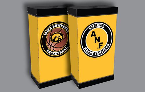 Made of Aluminum, Dual Sided Design on a Gold Body with Black Lid & Base. Printed & laminated. Approximate container size (22-3/4"W x 41-3/4"H x 13-1/4"D). Fits 42-55 gallon bag or standard recycling bag.