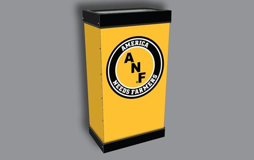 Made of Aluminum, Gold Body with Black Lid & Base. Printed & laminated. Approximate container size (22-3/4"W x 41-3/4"H x 13-1/4"D). Fits 42-55 gallon bag or standard recycling bag.