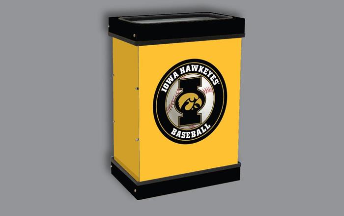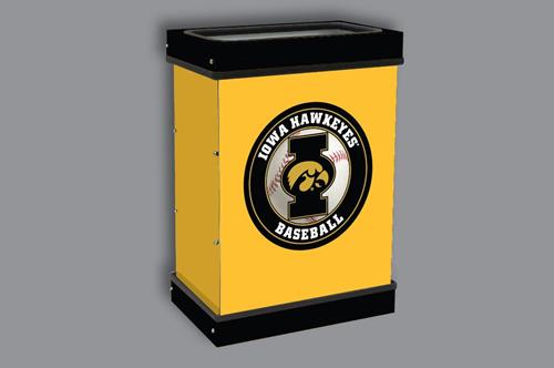 Made of Aluminum, Gold Body with Black Lid & Base, Printed & laminated. Approximate container size (16-3/4"W x 23-1/2"H x 9-3/4"D). Fits 13 gallon trash bag.