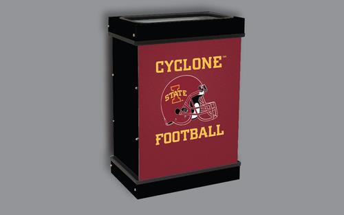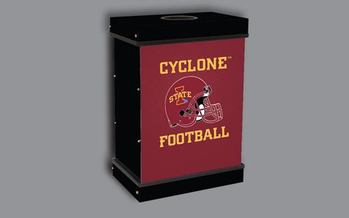 Made of Aluminum, Dark Red Front with Black Sides, Lid & Base. Printed & laminated. Approximate container size (16-3/4"W x 23-1/2"H x 9-3/4"D). Fits 13 gallon trash bag.